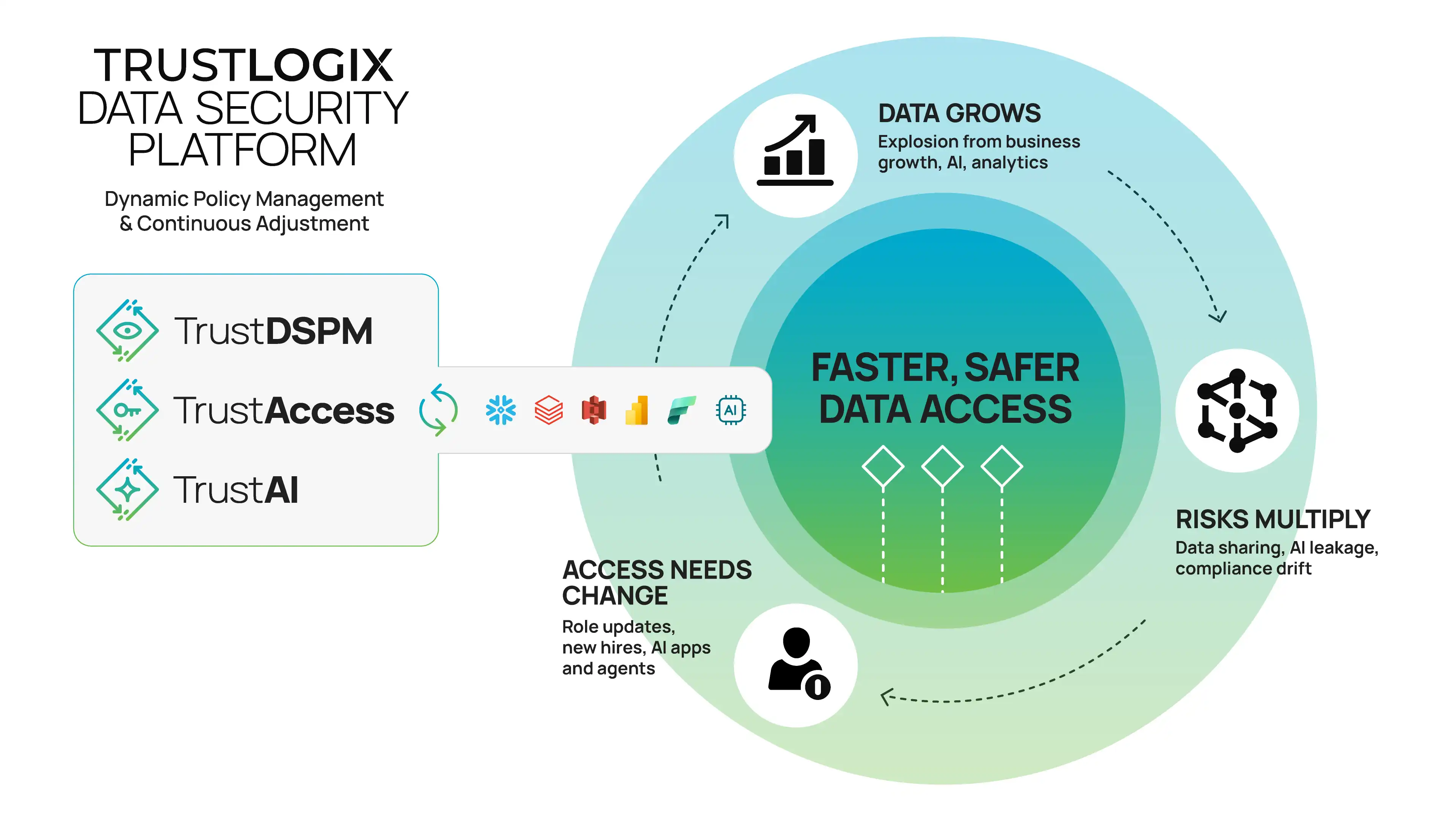 TrustLogix unifies security and data teams to deliver faster, safer access across on-premises databases, data clouds, analytics and AI Agents — eliminating risk and enabling innovation.